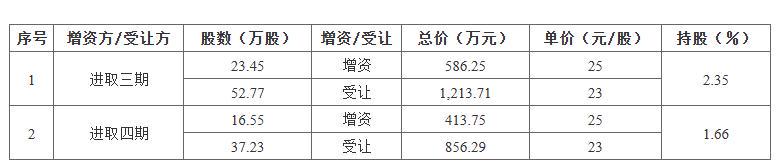 2024年11月4日,毅达玉澄、中小贰号、进取三期、进取四期、江阴金投、江阴联投分别以货币认购公司新增的注册资本61万元、59万元、23.45万元、16.55万元、40万元、40万元,增资价格均为25元/股。