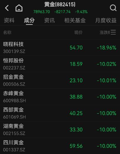 随着国际金价、银价持续大跌,黄金白银概念股再度掀起跌停潮,招金黄金、赤峰黄金、西部黄金、湖南黄金、四川黄金、中金黄金、山东黄金、湖南白银、白银有色等多股跌停。2月2日盘中,现货黄金一度大跌逾10%,最低下探至4402美元/盎司;现货白银一度暴跌逾16%,抹去年内全部涨幅,最低下探至71美元/盎司。