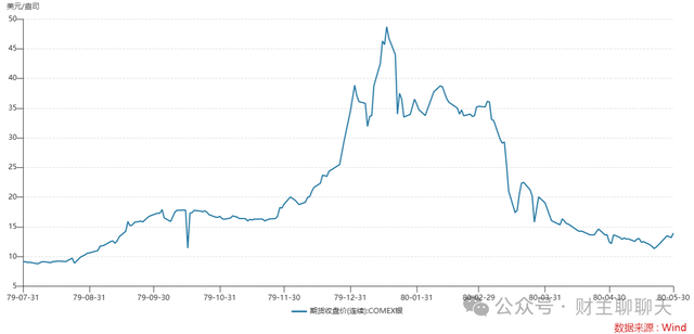 下图,是1979-1980年白银价格遭遇亨特兄弟逼仓,价格从当时接近10美元一路暴涨至接近50美元,当时的Comex为了应对逼仓,也是不得不一次次地上调保证金,最后修改了白银期货交易规则,规定只能平仓不能开仓,于是银价暴跌,一路跌回到15美元左右。
