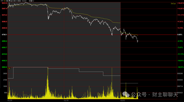 不仅白银如此,黄金同样是从大幅度上涨3%到现在转成下跌4%(如下图)。