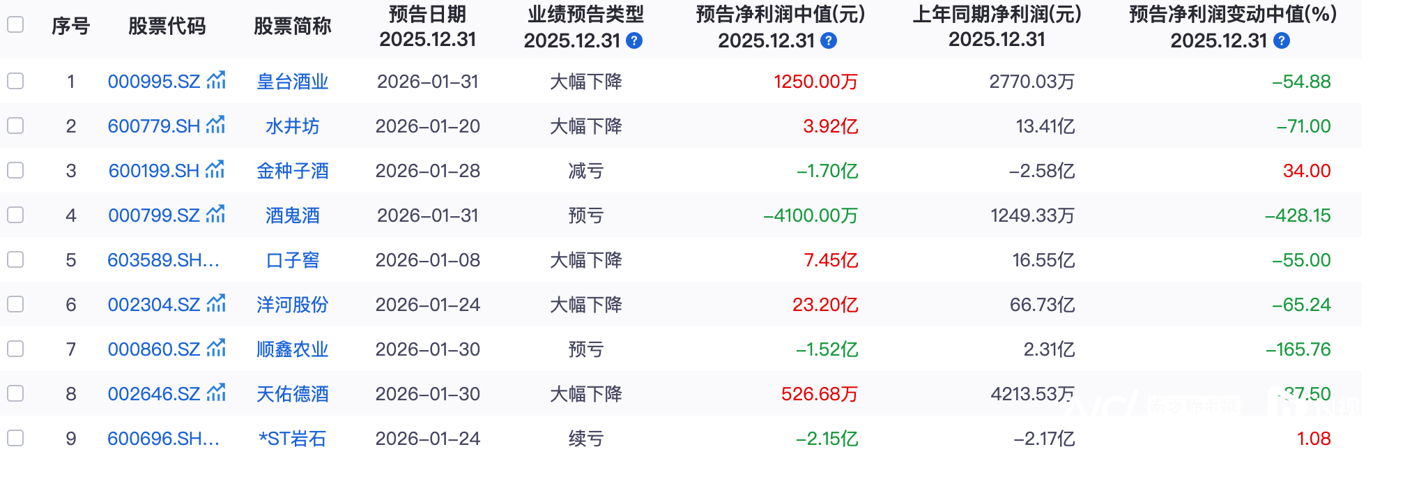发布2025年业绩预告的白酒公司,数据来源于同花顺iFind