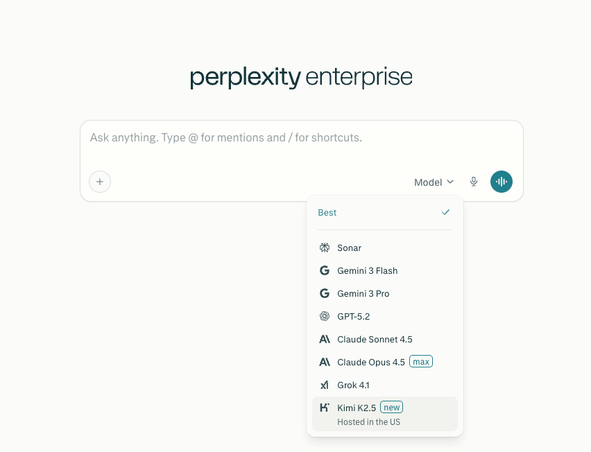 全球最大、估值超千亿的AI搜索创业公司Perplexity,第一时间上架了Kimi K2.5模型,作为给付费用户的高级模型使用。在Perplexity平台上,这也是唯一的中国模型。