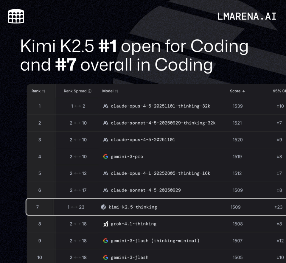 从AI行业权威的评测机构LMarena(大模型匿名竞技场)代码能力基准测试中,这个名为Kimi K2.5的中国模型,排在全球开源模型的第一位,仅次于Claude和谷歌Gemini最新的旗舰模型。在前10名的榜单中,也是唯一的中国模型。