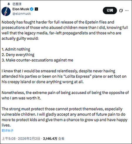 马斯克还说:“被指控为与自身品格截然相反的人,这种痛苦虽然剧烈,但为了保护弱势儿童,一切都是值得的。”马斯克认为:“强者必须挺身保护无法自保的人,为了让孩子们有机会平安长大并拥有幸福生活,他愿意承担未来任何程度的诋毁与伤痛。”