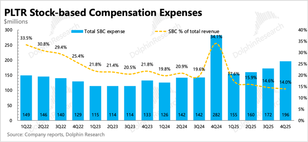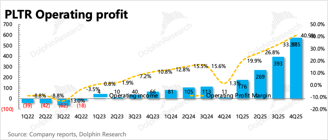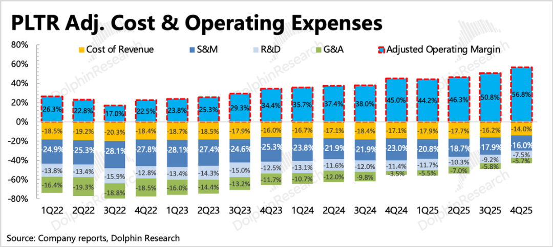四季度Palantir实现GAAP下经营利润5.75亿,三项经营费用中本季度销售费用、管理费用的增长有明显下降。最终带来GAAP下经营利润环比提高了7个点,达到41%,加回折旧和SBC后的经调整经营利润达到57%。