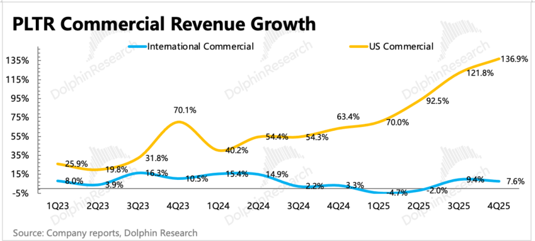 美国企业收入是Palantir未来增长的核心动力,也是估值的主要支撑点。四季度美国商业收入加速到137%,高基数下继续“狂飙”。
