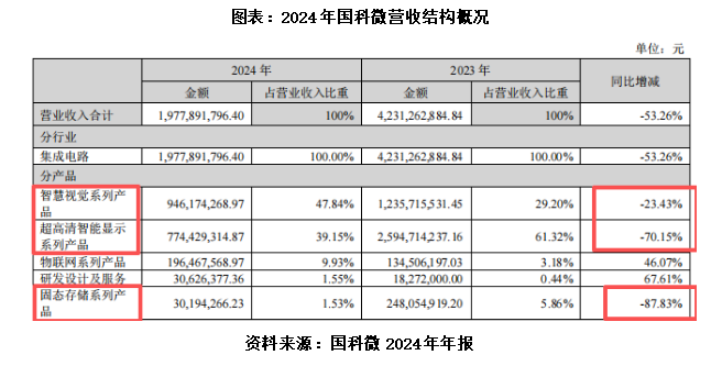 事实上,国科微的业绩承压并非突发状况,2024年已呈明显的下滑态势。当年该公司实现营业总收入19.78亿元,同比大幅下降53.26%,业绩腰斩。其中,智慧视觉、超高清智能显示系列产品的营收分别同比下滑23.43%、70.15%,而固态存储系列产品营收跌至3019.43万元,同比下滑87.83%。