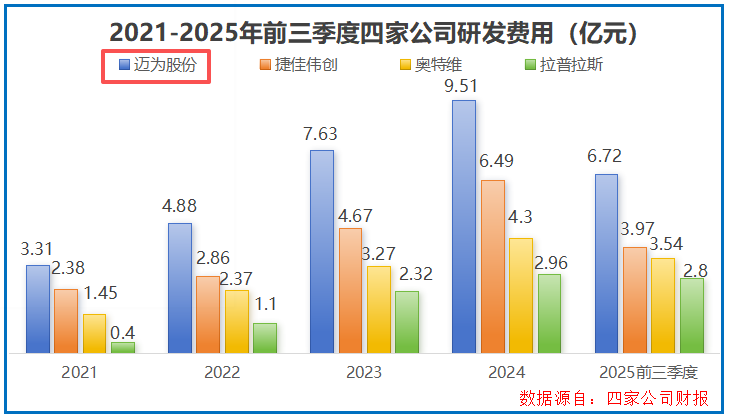 这些成绩的背后,都离不开迈为股份对研发的持续投入。2021年至2025年前三季度,公司研发费用累计达32亿元,比捷佳伟创、奥特维等一众同行都要高。