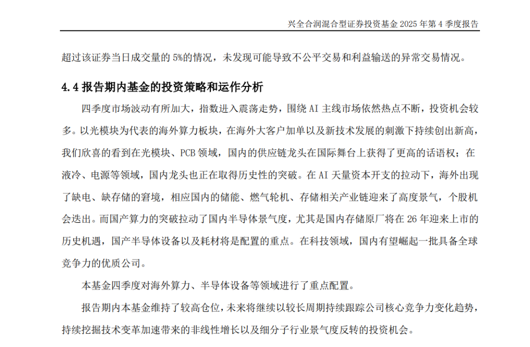 兴全合宜混合和兴全社会价值三年持有能够投资港股,四季度对海外算力、半导体设备等领域进行了重点配置。同时,还在港股市场维持部分港股优质创新药、互联网资产的配置。
