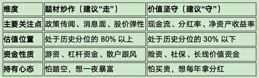 下面,我们来列表比对一下“走”与“守”的战略适配场景: