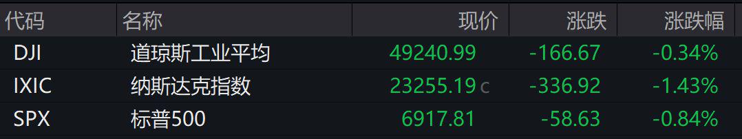 美东时间2月3日16:00(北京时间2月4日5:00),道指收跌166.67点,报49240.99点,跌幅为0.34%;纳指收跌336.92点,报23255.19点,跌幅为1.43%;标普500指数收跌58.63点,报6917.81点,跌幅为0.84%。