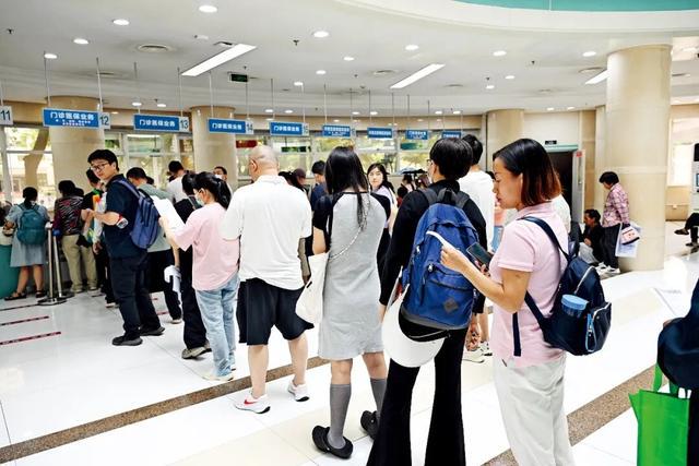 2025年6月4日,陪诊师张晴(右一)排队为客户办理医保联网。图/IC
