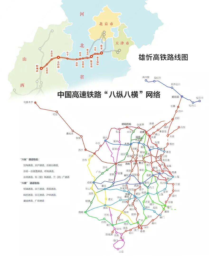 中国高速铁路“八纵八横”网络及雄忻高铁路线图