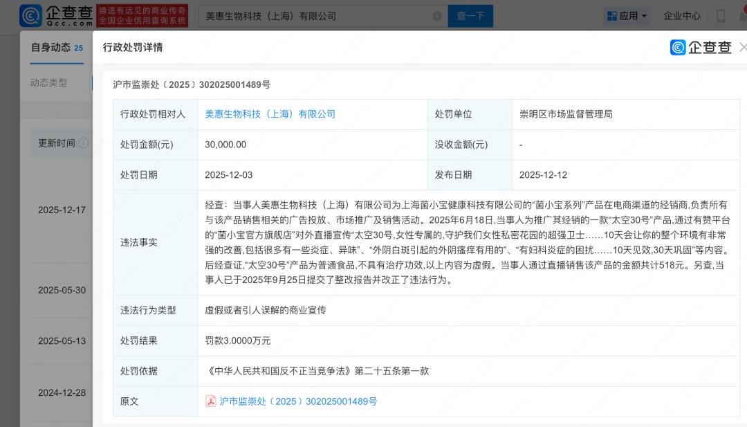 据封面新闻、南都湾财社等媒体报道,近日,益生菌品牌菌小宝的电商渠道经销商美惠生物科技(上海)有限公司,因在产品宣传中宣称可改善妇科炎症等不实内容,被上海市崇明区市场监督管理局罚款3万元。