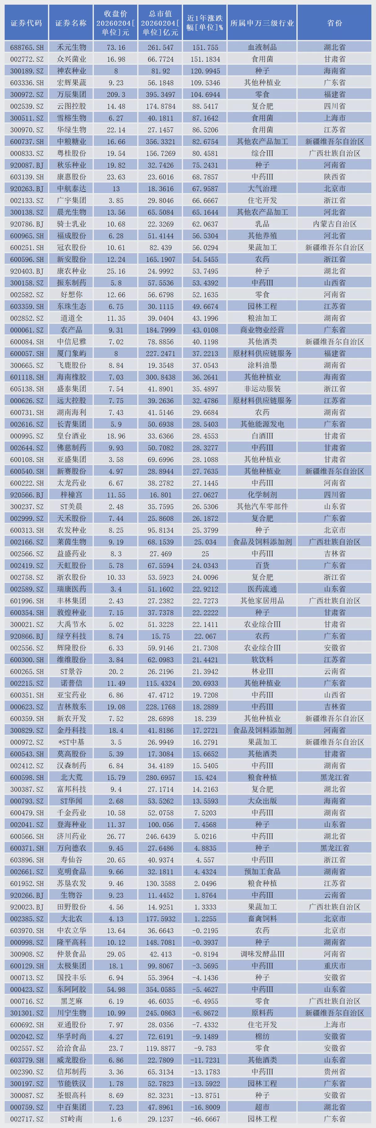 从二级市场表现看,近一年来,93家上市公司中,股价实现上涨的有75家。其中,22家涨幅超过50%。禾元生物(688765.SH)、众兴菌业(002772.SZ)、神农种业(300189.SZ)、宏辉果蔬(603336.SH)、万辰集团(300972.SZ)等5家公司股价涨幅成功实现翻倍。