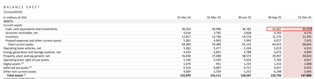 但幸好特斯拉口袋还有钱。截至2025年第四季度末,特斯拉现金、现金等价物及投资总额也达到441亿美元(约合人民币3063亿元),环比增加24亿美元。