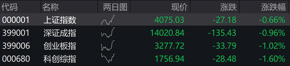 上证指数低开0.66%,深证成指低开0.96%,创业板指低开1.02%,科创综指低开1.60%。