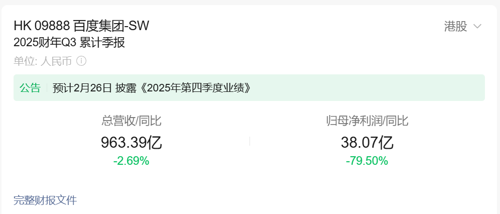 据相关公告显示,百度预计2月26日披露《2025年第四季度业绩》。