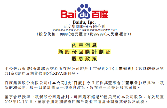2月5日,百度集团在港交所公告称,预计于2026年首次派发股息。公司授权实施一项新的股票回购计划,最高回购金额为50亿美元。