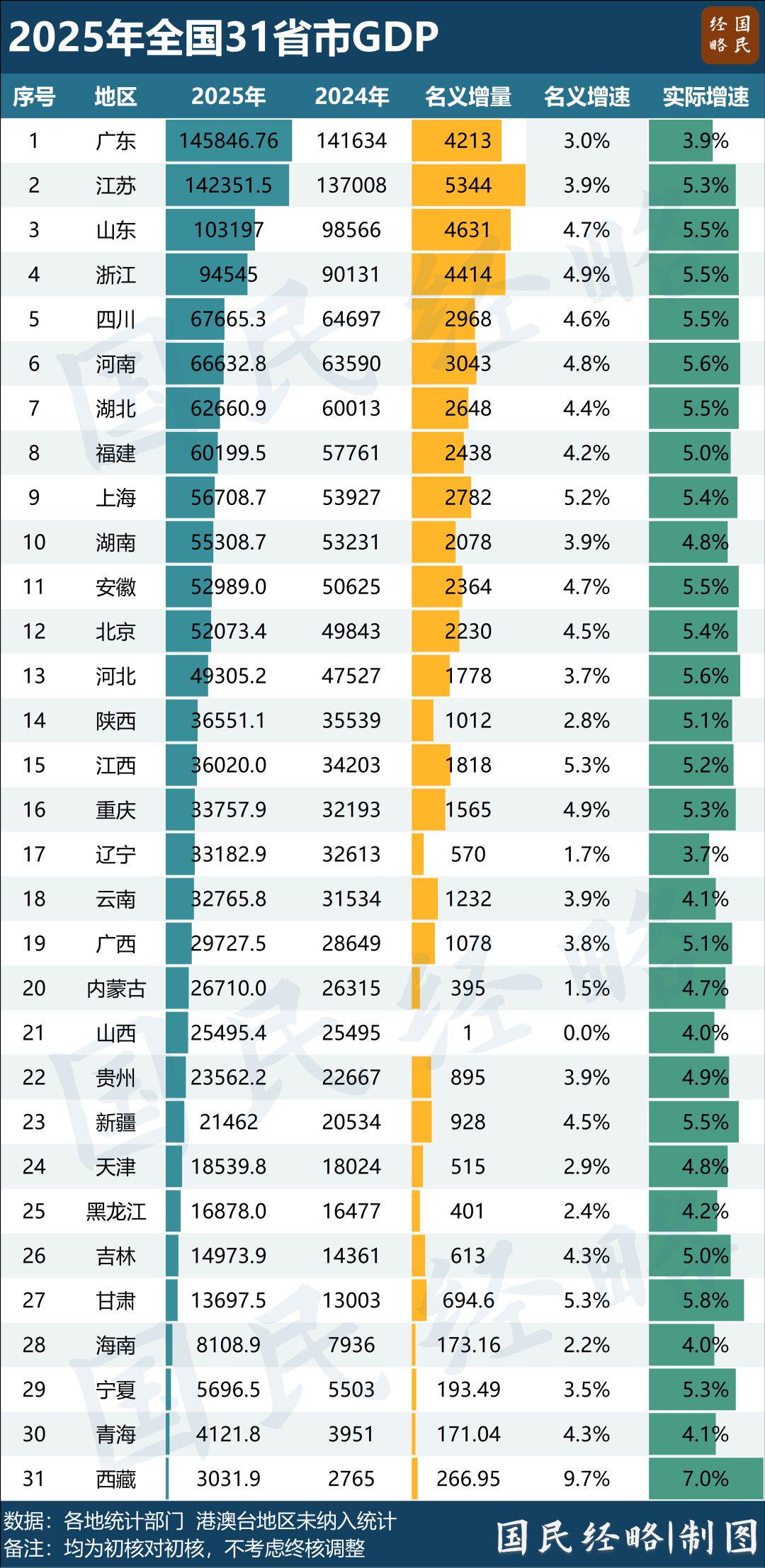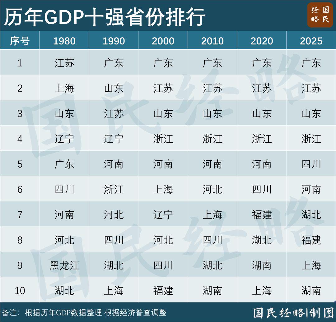 接下来,第五名是四川省,排名保持不变;第六名是河南省,与四川仅相差1000亿元。河南、四川都是中西部第一大省的有力竞争者。此外,2025年重庆市凭借5.3%的经济增速,反超辽宁省,位居全国第16名。