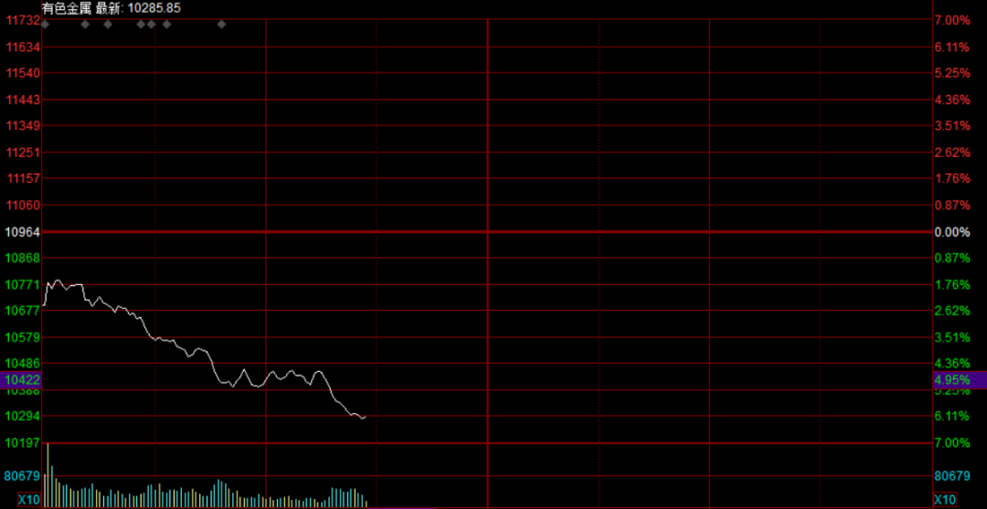 10:54有色金属板块持续下探,晓程科技跌逾10%,湖南黄金、四川黄金、白银有色、河钢资源等多股跌停。