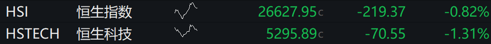 恒生指数低开0.82%,恒生科技指数跌1.31%。科网股多数走低,哔哩哔哩、新东方跌逾4%,腾讯音乐、华虹半导体跌逾3%,阿里巴巴、中芯国际等跌逾2%。