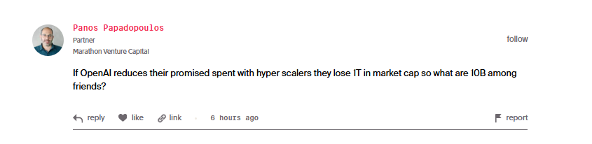 Marathon Venture Capital合伙人Panos Papadopoulos在评论区写道:“如果OpenAI减少对超大规模云厂商的承诺支出,他们会损失1万亿美元市值,那朋友之间100亿美元算什么?”