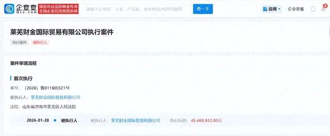 1月28日,莱芜财金国际贸易有限公司被济南市莱芜区人民法院列入被执行人名单,执行标的金额为4546.89万元,相关案件案号为(2026)鲁0116执521号。据悉,该公司为国有企业,由齐鲁财金(山东)经济发展有限公司100%控股,主营金属矿及制品、铁矿石等相关业务,这并非其首次被列为被执行人,此前的2025年12月15日,该公司曾与齐鲁财金一同被湖北省武汉市中级人民法院列为被执行人,执行标的约1.44亿元。