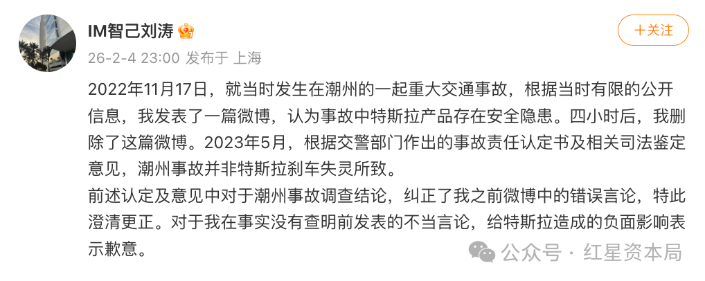 红星资本局2月5日消息,昨日晚间,智己汽车联席CEO刘涛在社交平台就此前言论向特斯拉道歉。