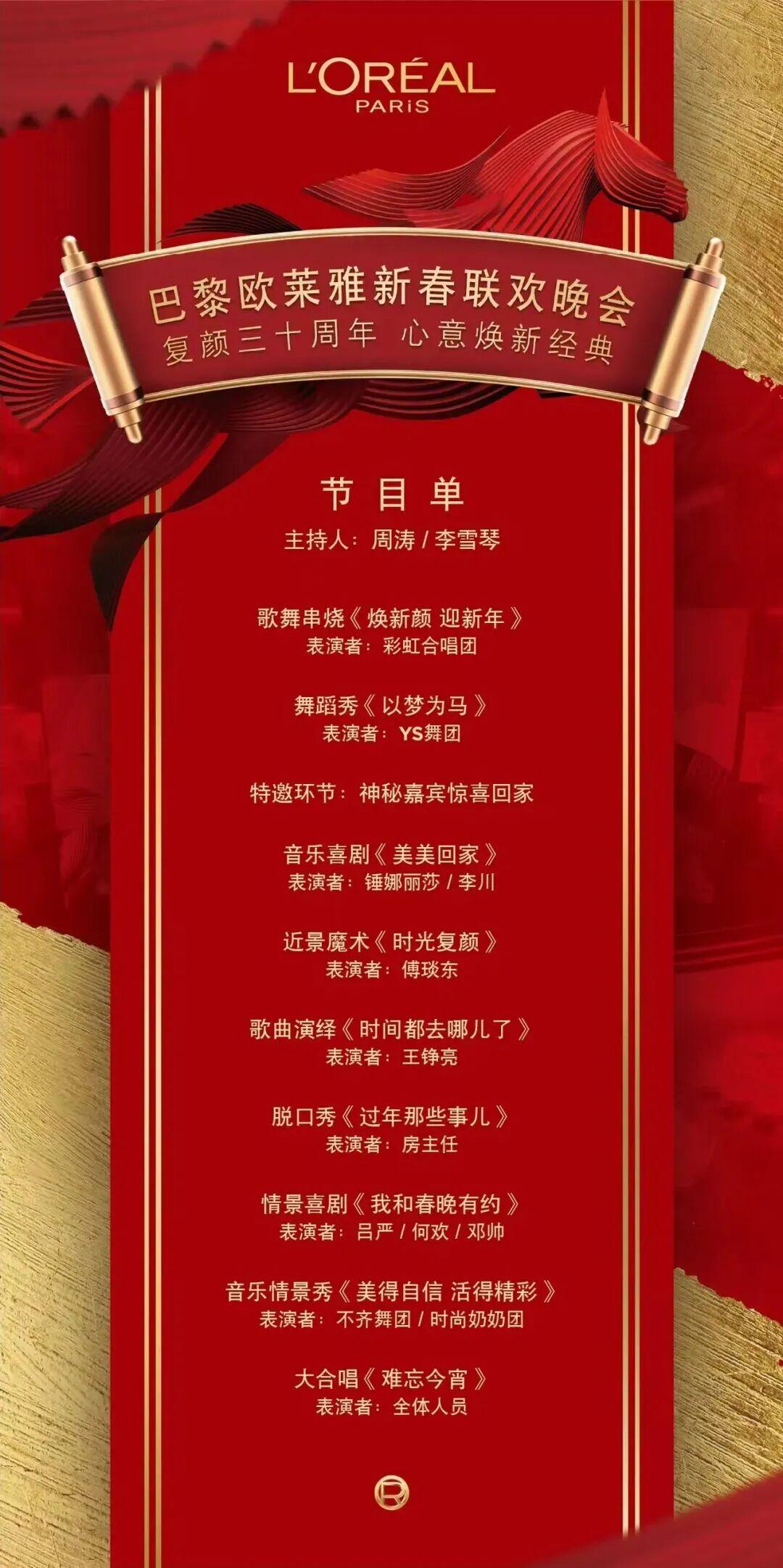 2月4日,巴黎欧莱雅举办三十周年新春联欢晚会,邀请著名主持人周涛以及众多明星出席,在天猫、京东、抖音、微博、视频号等线上平台直播。