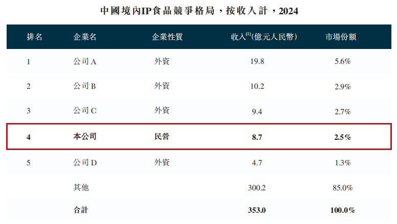 金添动漫在招股书中表示,截至2024年,按收入计算,自己分别是中国最大的IP趣玩食品企业和中国第四大IP食品企业,市场份额分别为7.6%和2.5%。