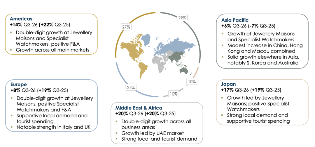 虽然制表业务本季度在各地区市场也都实现了收入正增长,对公司整体的收入增长有所贡献,但增速水平明显不及珠宝业务。反映在财务上,制表业务在FY26 Q3的收入为9亿欧元,同比增长7%(固定汇率),对应的收入占比为14%。制表业务在不同区域市场的表现迥异,美洲、中东及非洲的需求相对更加强劲。