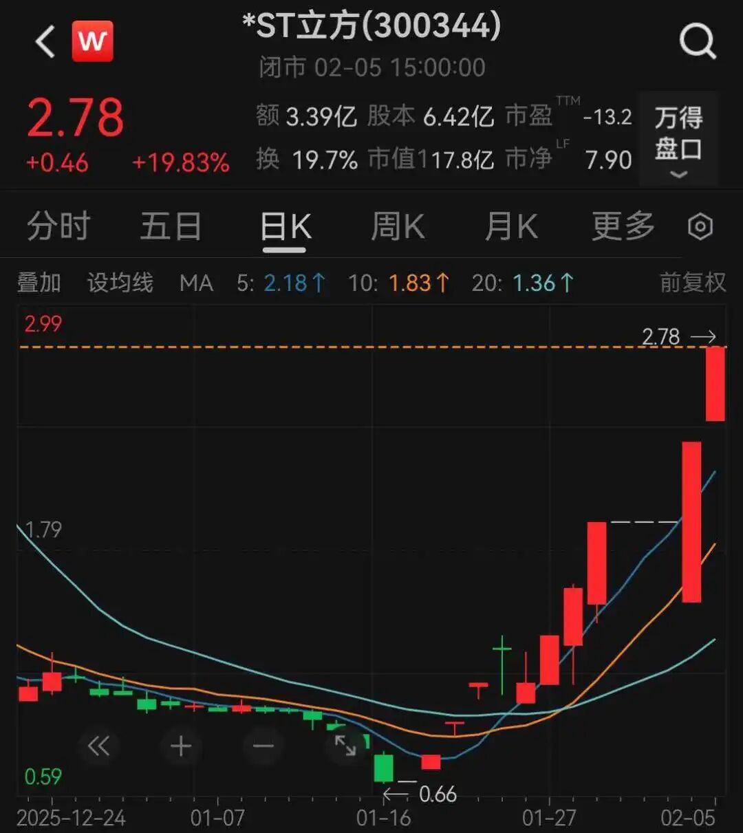 截至今日收盘,*ST立方再度20%涨停,报2.78元,总市值约18亿元。