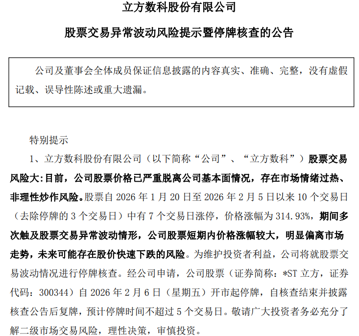 2月5日晚, *ST立方公告,公司股票短期内价格涨幅较大,明显偏离市场走势,未来可能存在股价快速下跌的风险。为维护投资者利益,公司将就股票交易波动情况进行停牌核查。