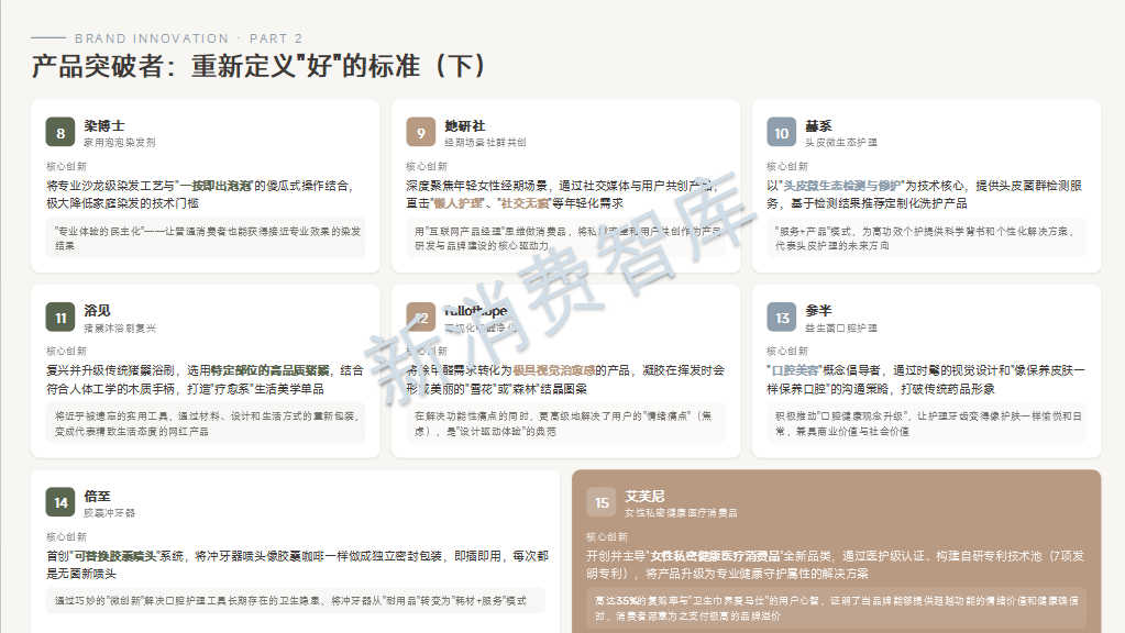 本部分新消费智库将以更具结构化的方式,盘点在产品突破、模式革新、技术应用、设计美学及社会责任五个维度上表现卓越的15个国内新锐品牌。每个品牌都将附上其核心创新点、代表产品及行业影响分析