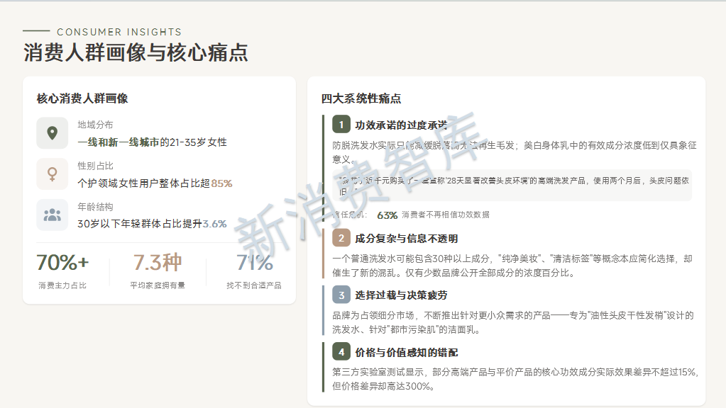 这种“丰裕中的匮乏”反映了行业细分策略的副作用。品牌为占领细分市场,不断推出针对更小众需求的产品——专为“油性头皮干性发梢”设计的洗发水、针对“都市污染肌”的洁面乳、适合“硬水地区”的沐浴露。