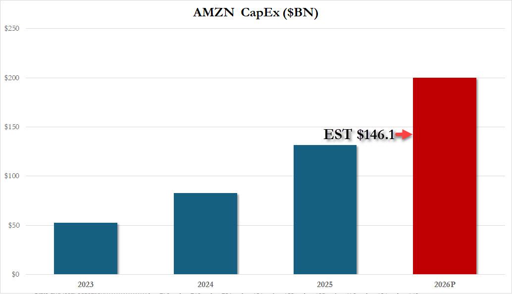 亚马逊2025年第四季度总营收和备受关注的云业务AWS收入增长均强于预期。而亚马逊预计2026年的资本支出将约为2000亿美元,较2025年增长50%,较华尔街预期的支出水平1461亿美元高约36.9%。由于支出意外猛增,亚马逊今年的营业利润指引均值较分析师预期低逾14%。