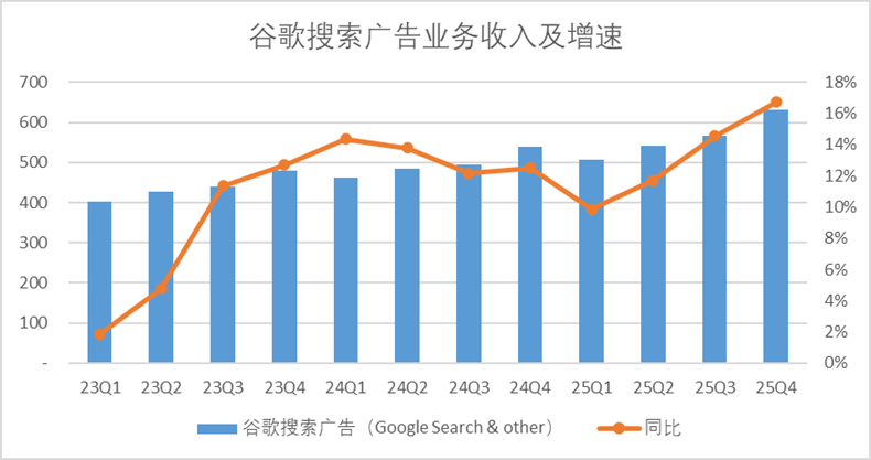 四季度谷歌搜索广告营收录得630.73亿美元,高基数下同比增长16.7%,是表现最为出色的业务之一。