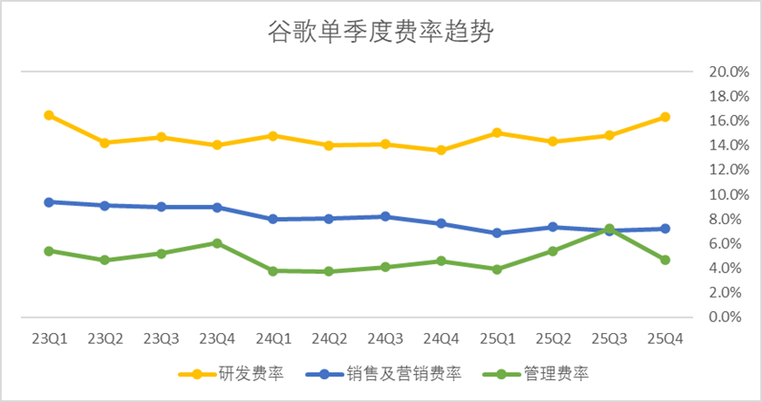成本方面,四季度谷歌的研发费用录得186亿美元,销售及营销费用录得82亿美元,行政管理费用录得53亿美元,从费率曲线上来看,研发费用在高营收的背景下,突破了16%,销售费用控制在了7%左右,管理费用大幅降至5%左右。