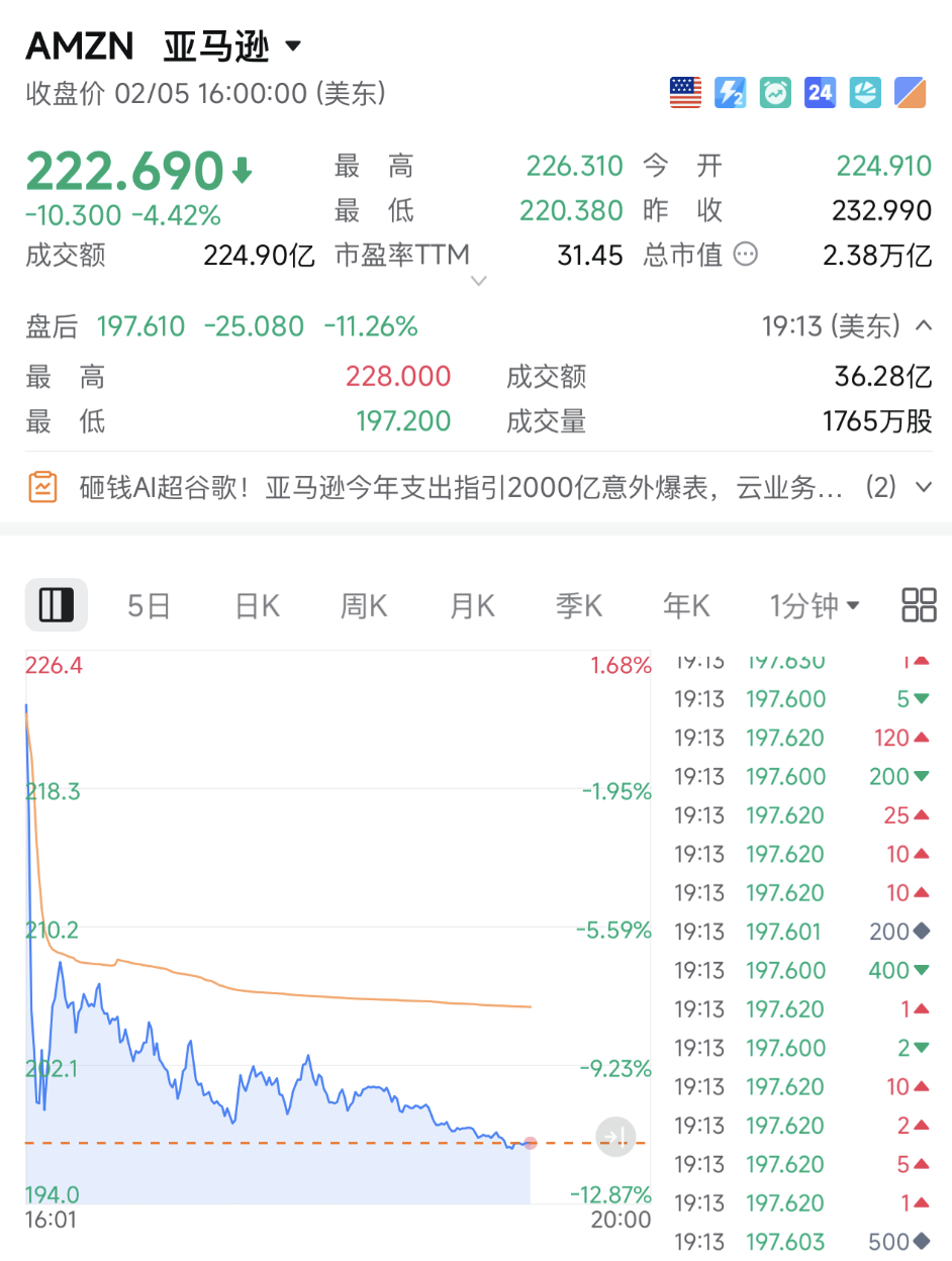 美东时间2月5日,美股盘后,亚马逊股价大幅杀跌,一度暴跌超11%,截至发稿,跌幅仍达11.26%。
