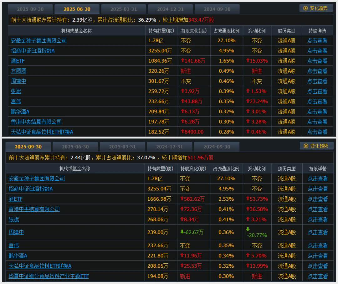 ▲2025年Q2和Q3金种子酒前十大流通股东持仓