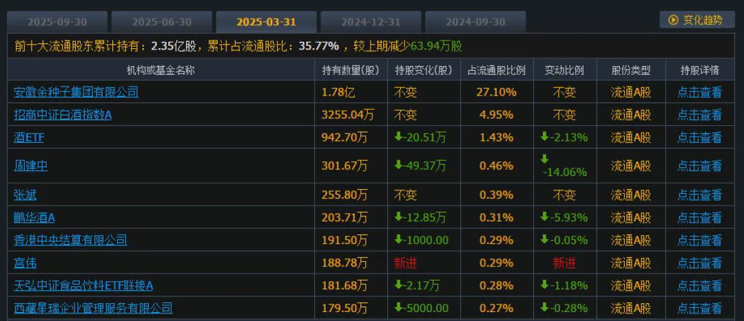 ▲2025年一季度末,金种子酒前十大流通股股东情况
