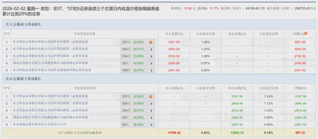 买卖金额前三的营业部分别为东方财富拉萨东环路第一营业部、东方财富拉萨团结路第二营业部、东方财富拉萨团结路第一营业部,这几个营业部通常被称为“拉萨天团”,又称“散户大本营”,交易风格都是以短线交易为主。