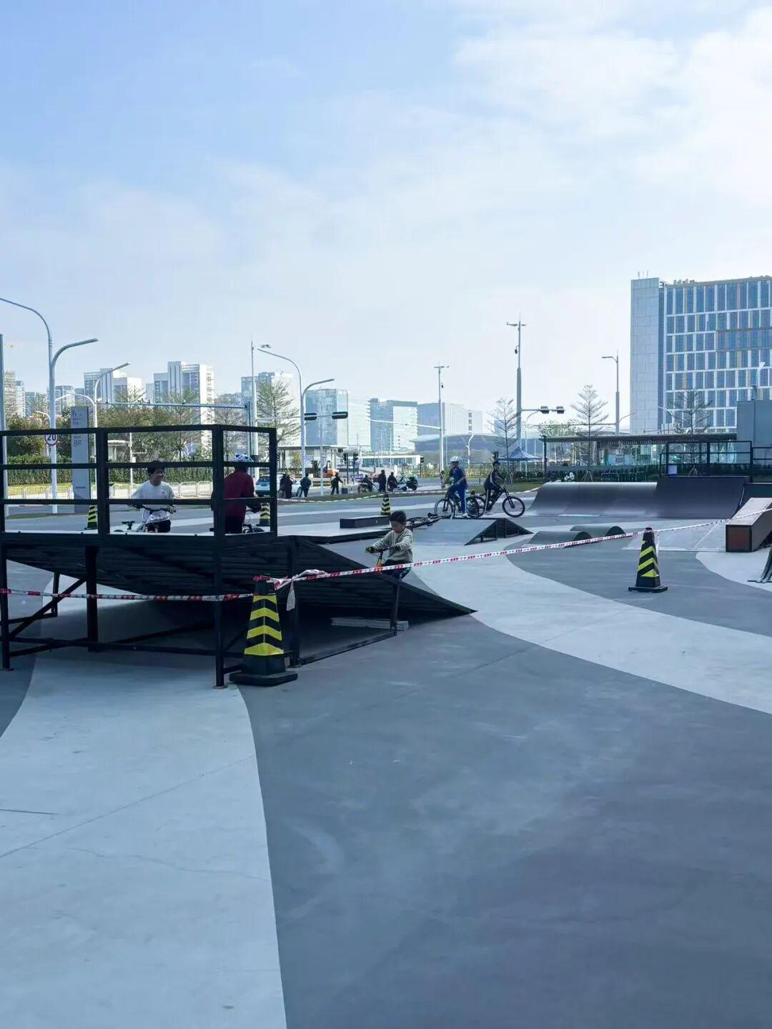 但现实有些骨感。在我线下转悠时,超感公园综合体附近的开放区域,目前只有几个被围起来的小坡道,小孩哥们玩得不亦乐乎。