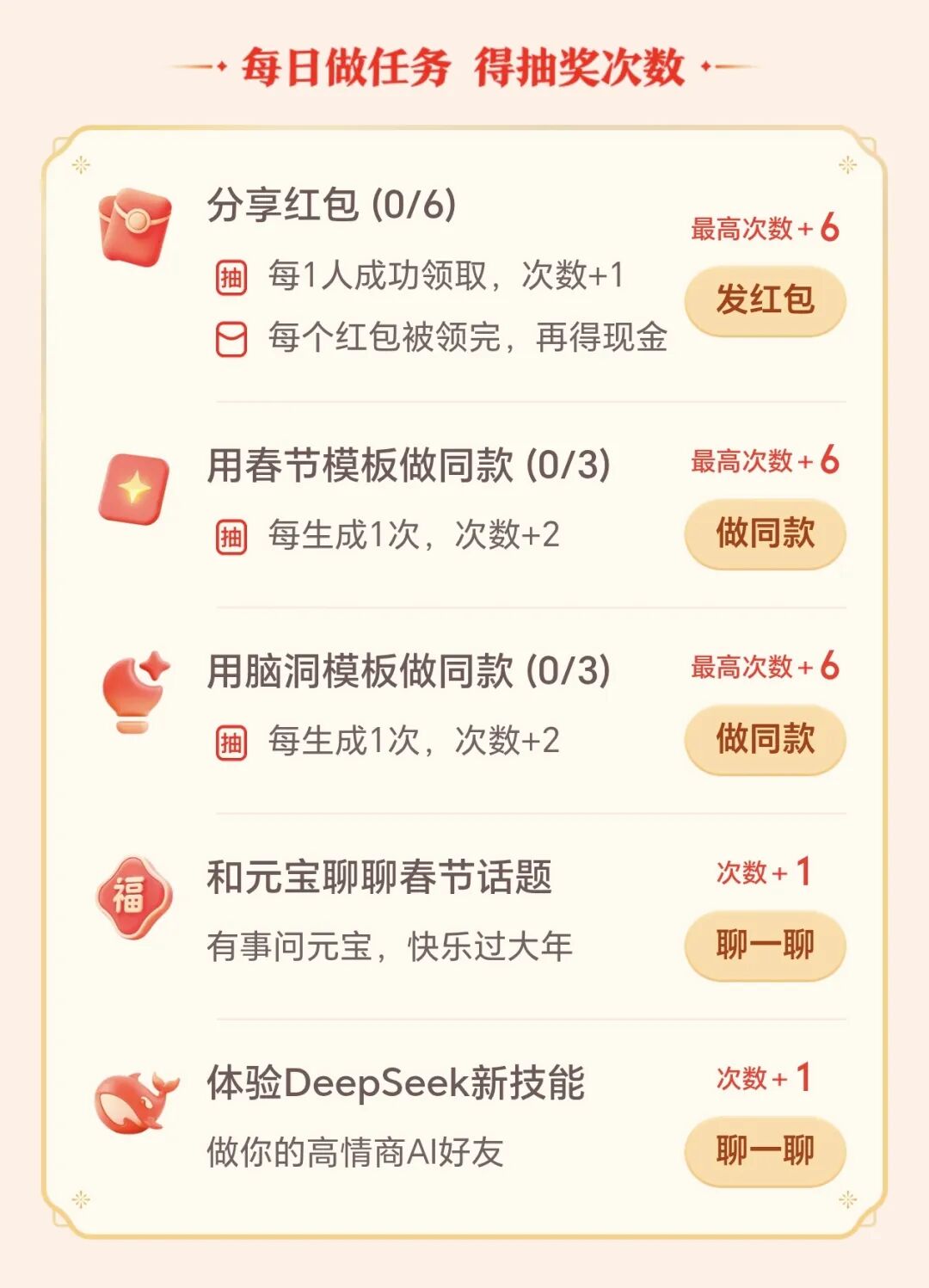 其实元宝红包这次的还不只想拉新,也是想留存的,比如和元宝聊天、用模板做,都能获取抽卡次数,从而增强粘性。