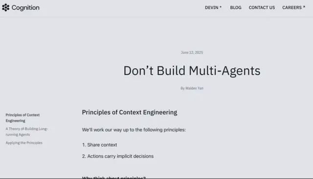 那是在2025年6月,Cognition官方下场,撰写文章《不要构建多智能系统》。他们主张用单一智能体+强大的上下文工程来实现长期可靠的agent行为,尤其适合深度、连续、顺序性强的任务,如软件工程、编码全流程。