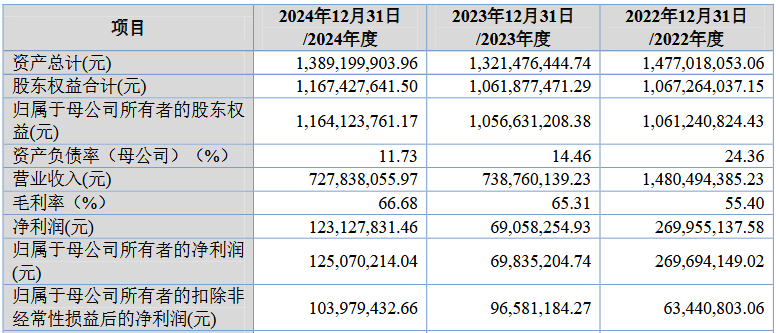 近年来,康华股份的经营业绩出现明显波动。2022年,该公司实现营收14.8亿元,归母净利润达2.7亿元。然而进入2023年,其业绩出现大幅下滑,营业收入骤降至7.39亿元,归母净利润也同步缩水至0.70亿元。到了2024年,康华股份营收延续下行趋势,下降至7.28亿元,归母净利润虽回升至1.25亿元,但仍未恢复至2022年水平的一半。