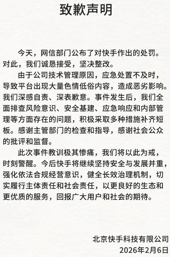 同一日快手发布致歉声明,表示诚恳接受,坚决整改。