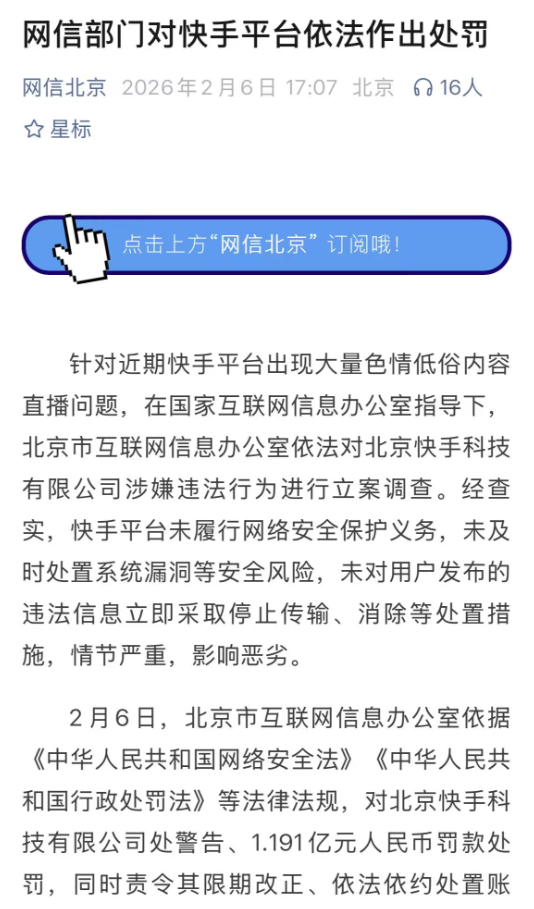 2026年2月6日,北京监管部门为快手送来了价值1.191亿元的“合规账单”。