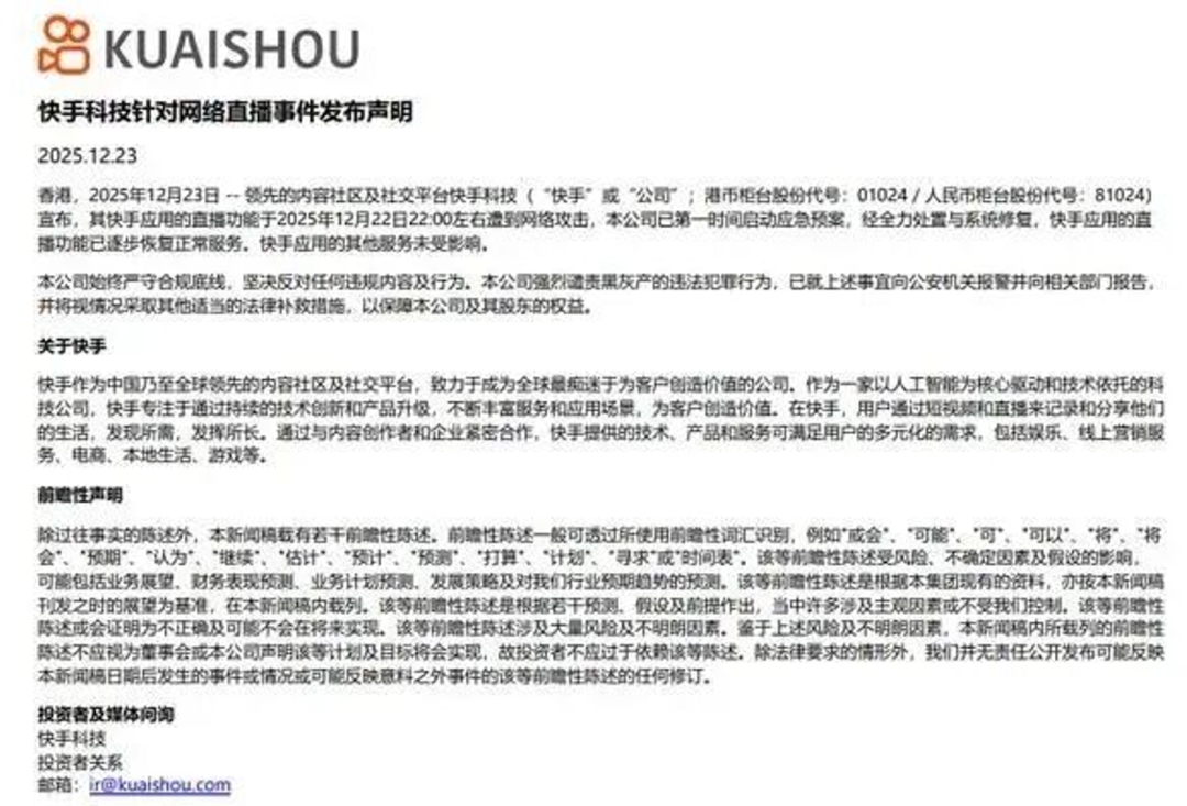 针对该事件,12月23日上午快手向公安机关报案。